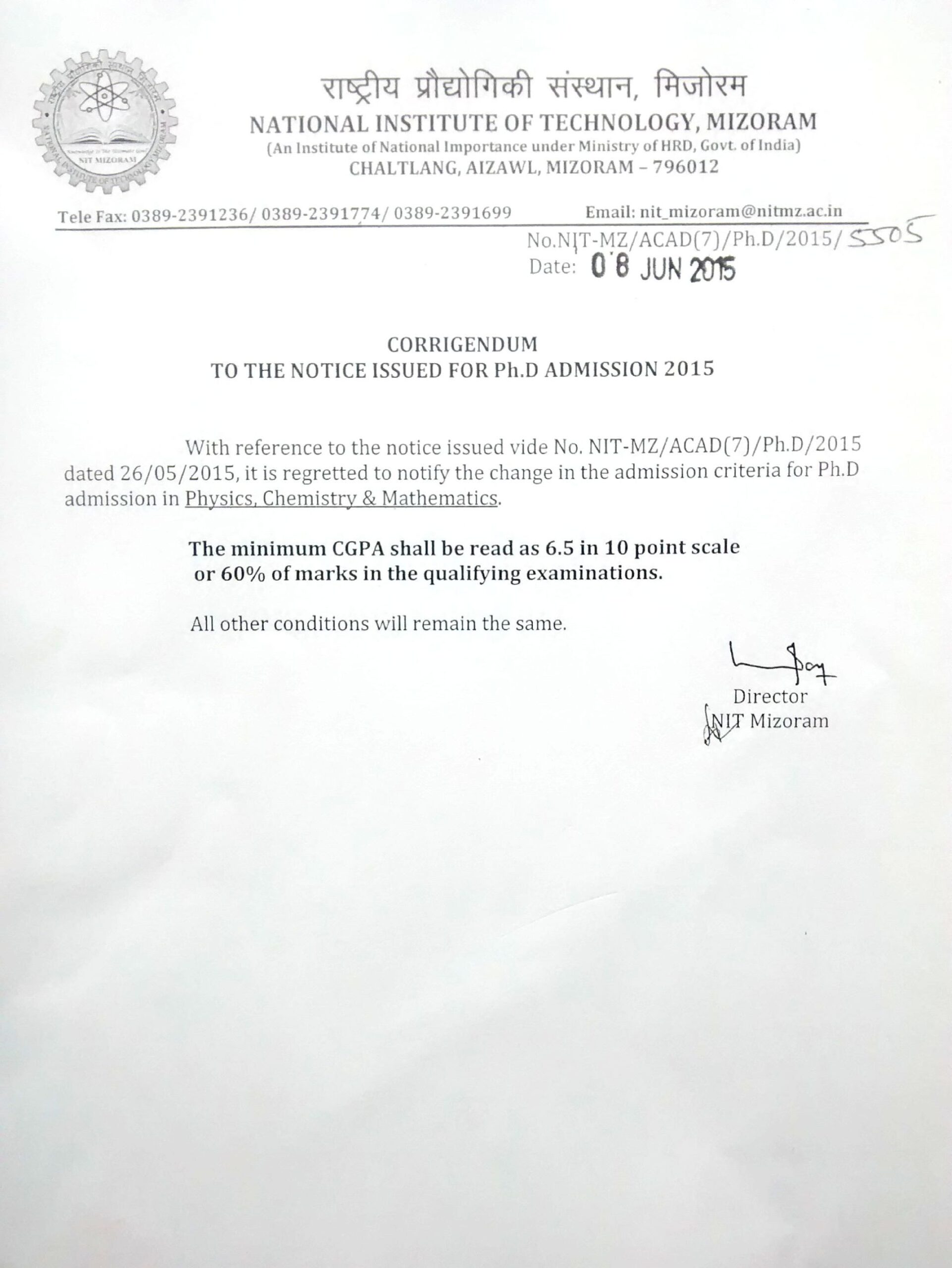 2.     Corrigendum to notice for admission to Ph.D 2015
