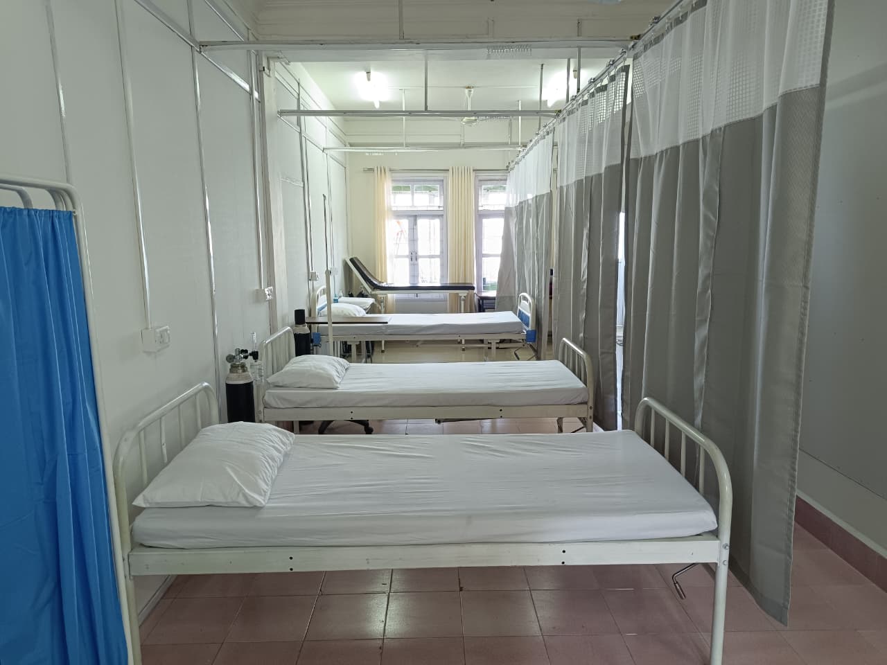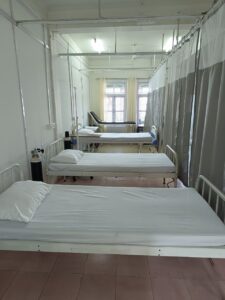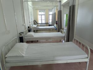 There are 2 hospital beds and it is stocked with emergency treatment utilities and medicines.